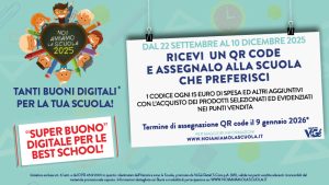 Dal 22 Settembre al 10 Dicembre 2025, tutti i Clienti che faranno la spesa nei Punti Vendita aderenti, riconoscibili dal materiale promozionale esposto, riceveranno un QR code cartaceo ogni 15,00 euro di spesa da assegnare ad una Scuola scelta fra le partecipanti ((Istituti Comprensivi, Scuole Statali e Paritarie di 1° e 2° grado, Asili Nido e Scuole dell’Infanzia Paritarie), presenti su territorio italiano.